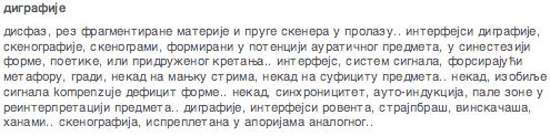 disfaz, rez fragmentirane materije i pruge skenera u prolazu.. interfejsi digrafije, skenografije, skenogrami, formirani u potenciji auraticnog predmeta, u sinesteziji forme, poetike, ili pridruzenog kretanja.. interfejs, sistem signala, forsirajuci metaforu, gradi, nekad na manjku strima nekad na suficitu predmeta.. nekad, izobilje signala kompenzuje deficit forme.. nekad, sinhronicitet, auto-indukcija, pale zone u reinterpretaciji predmeta.. digrafije, interfejs rowenta, brushstripe, wineglass, hanami.. skenografija, isprepletena u aporijama analognog..